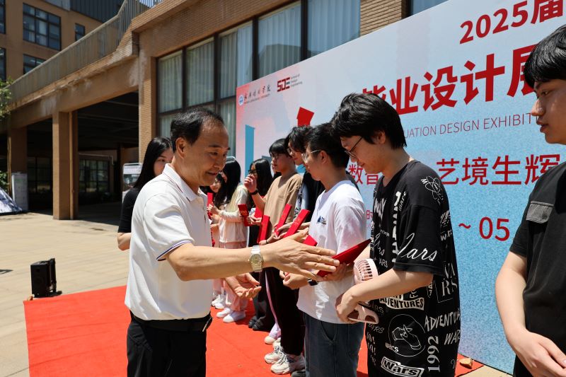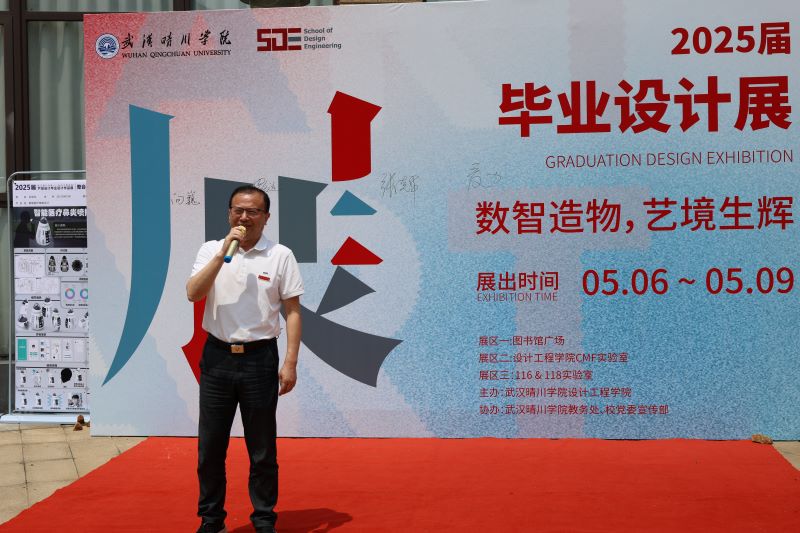 校长汪彬教授在讲话中充分肯定学院“产教融合、数艺共生”育人成果,对毕业生的成长表示欣慰。他指出,毕业展既是专业学习的汇报,更是向社会展示设计力量的窗口,希望同学们做到三点,一是坚守匠心,以科技为翼、艺术为魂,在造物中传递人文温度。二是勇于突破,在数智浪潮中保持创新锐度,以设计赋能产业升级。三是胸怀家国,将个人理想融入时代发展,用作品诠释青年担当。校长的殷切寄语彰显了学校对毕业生的关怀与期望。