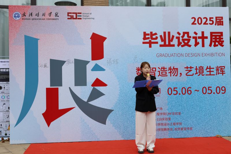 毕业生代表陈嘉怡同学发言时难掩激动之情,回顾了大学四年的学习历程,从初涉专业时的懵懂,到在一次次实践与创作中逐渐成长,每一件毕业设计作品都凝聚着同学们的心血与汗水,这些作品是设院学子对专业知识的深度理解与运用,也是对未来设计趋势的大胆探索。陈嘉怡代表全体毕业生,向悉心教导的学院领导和老师们表达了深深的感激之情,并表示将带着在学院学到的知识与精神,勇敢踏上新的征程,在设计领域发光发热。