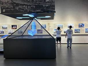 荆楚展厅以“天、地、人”的地域情怀为主线,呈现楚文化与建筑交融的多样风格。模型展示包含江汉关大楼,作为汉口开埠后城市转型象征,承载了几代人的记忆;古德寺则糅合哥特、罗马、拜占庭、伊斯兰等风格,体现“中西杂糅”特色。全息影像技术更让同学们身临其境地解读城市建筑的发展脉络。