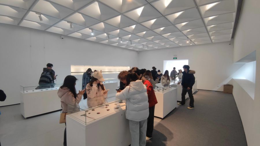 第一站来到中国地质大学博物馆,馆内丰富的地质标本与矿物晶体让同学们目不暇接。从亿万年历史的地质文化到色彩斑斓的宝石矿石,从地层演变的地质剖面到生态环境的复原场景,每一件展品都蕴含着自然与科学的美学密码。同学们认真观察展品的形态、色彩与纹理,详细记录细节,纷纷表示这些自然奇观为数字场景设计、角色造型创作提供了鲜活素材,让生态美学与科学元素的融合有了具象参考。